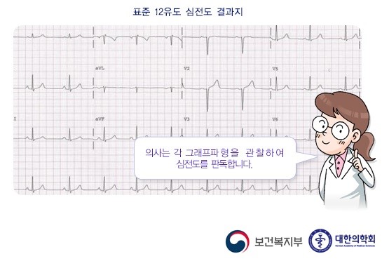 심전도 검사란 심장의 근육이 이동할 때 나오는 전기신호를 가슴, 팔, 다리의 피부에 연결한 전극을 통해 측정하여 심장의 이상 여부를 알아보는 검사입니다. 심근 중 충분한 혈액 공급이 되지 않는 부위는 전기 신호의 이상을 나타나게 되므로 진단을 할 수 있게 됩니다. 심전도 검사를 통해서 당장 응급치료가 필요한 심근경색을 쉽게 알 수 있습니다.